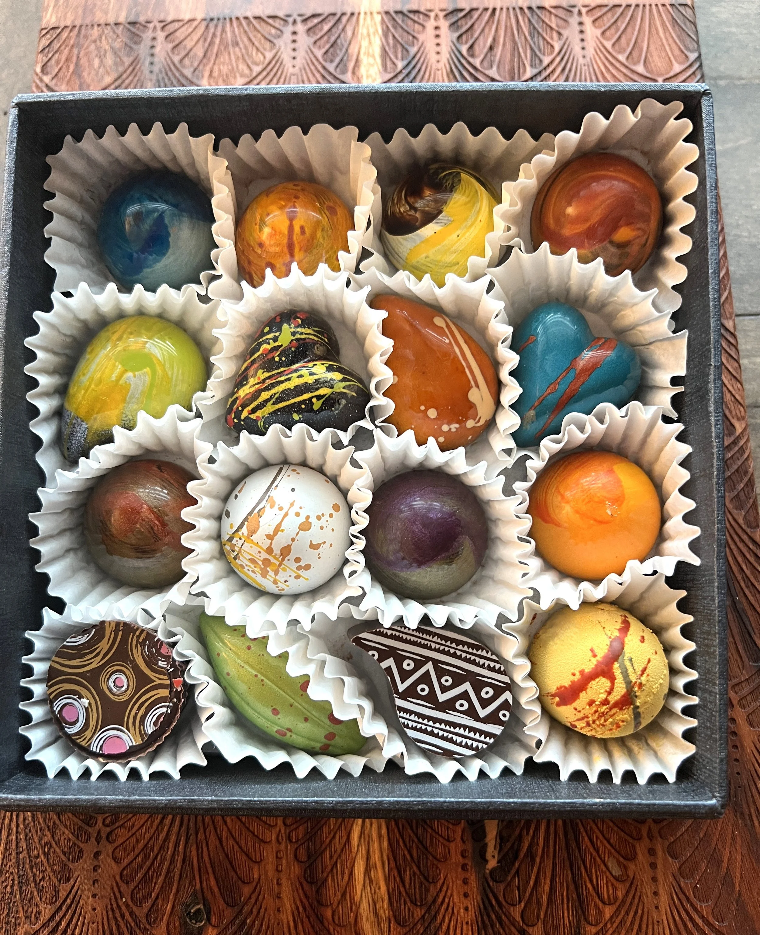 2nd row - yuzu milk chocolate caramel, passion fruit toffee caramel