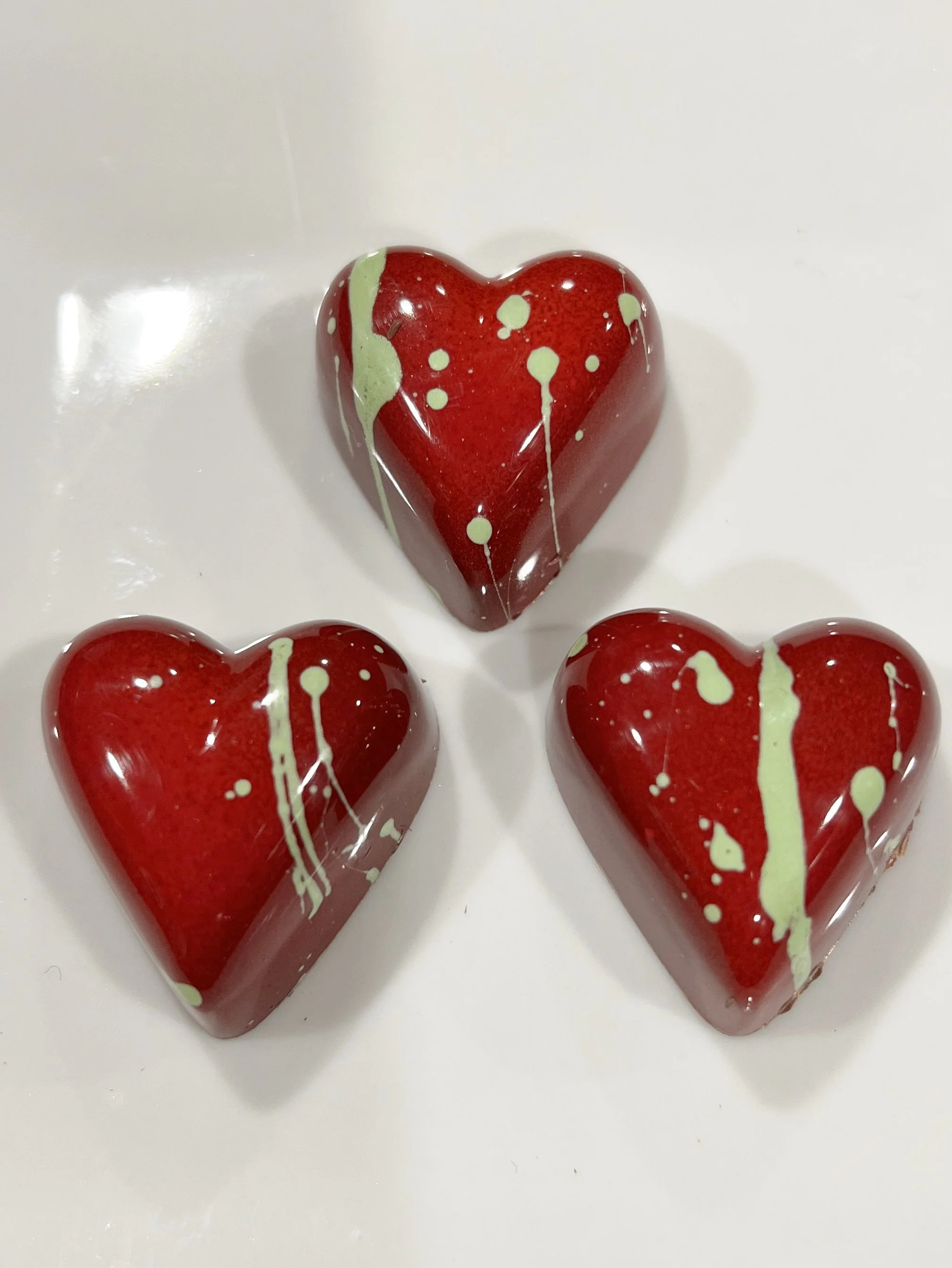 (passion fruit and yuzu ganache in a raspberry chocolate shell)